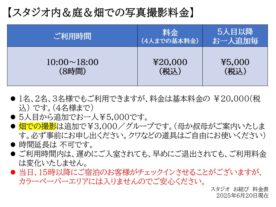 ○「日帰りコスプレ撮影」の場合はご利用日をご予約ください。