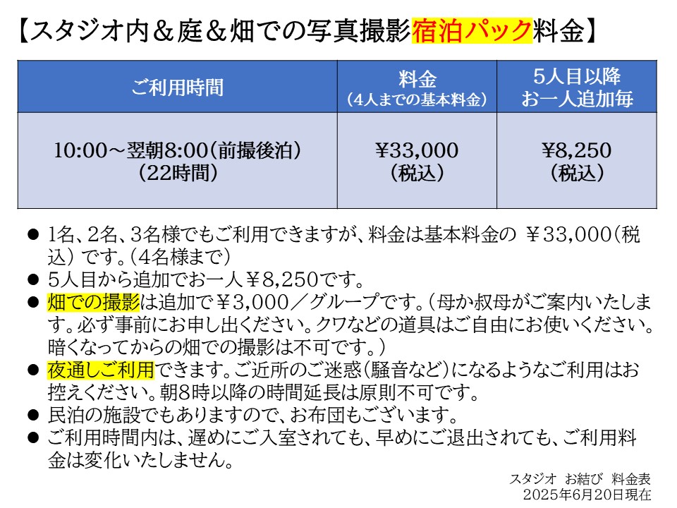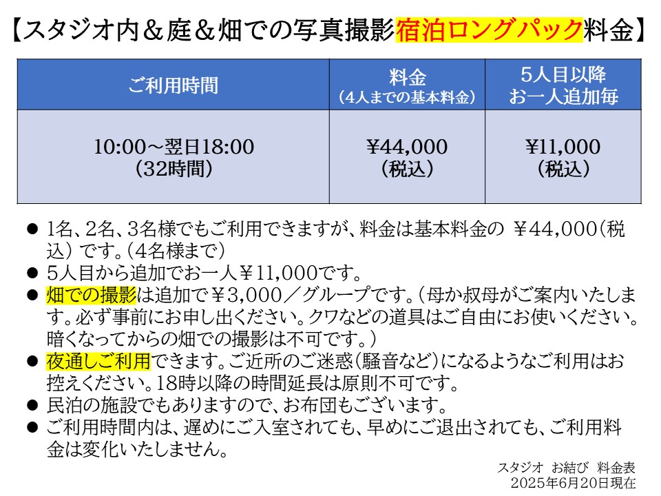 通常の撮影コースをご予約の際、予約フォームからのご予約の際に、終了時間がシステム上、22時まで表示されますが、終了時間は最大18時ですのでご了承ください。