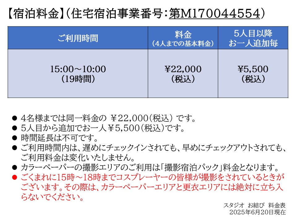 ご予約の際、メッセージ欄に「日帰りコスプレ撮影」「22時間宿泊パック利用」「32時間 ロングパック利用」「民泊宿泊利用」などご利用目的をご記入いただけますと幸いです。